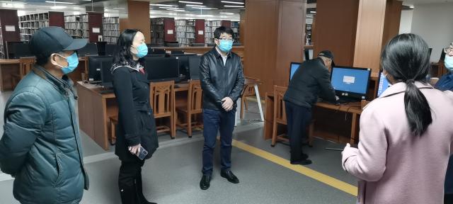 邓辉、刘小丽首先来到图书馆大厅服务咨询台,图书馆馆长贺三宝介绍了新馆的基本概况和疫情防控期间的开馆情况。随后,校领导视察了蛟湖书吧、视听室、研讨室、阅览室、江财文库等图书馆特色空间馆库。
